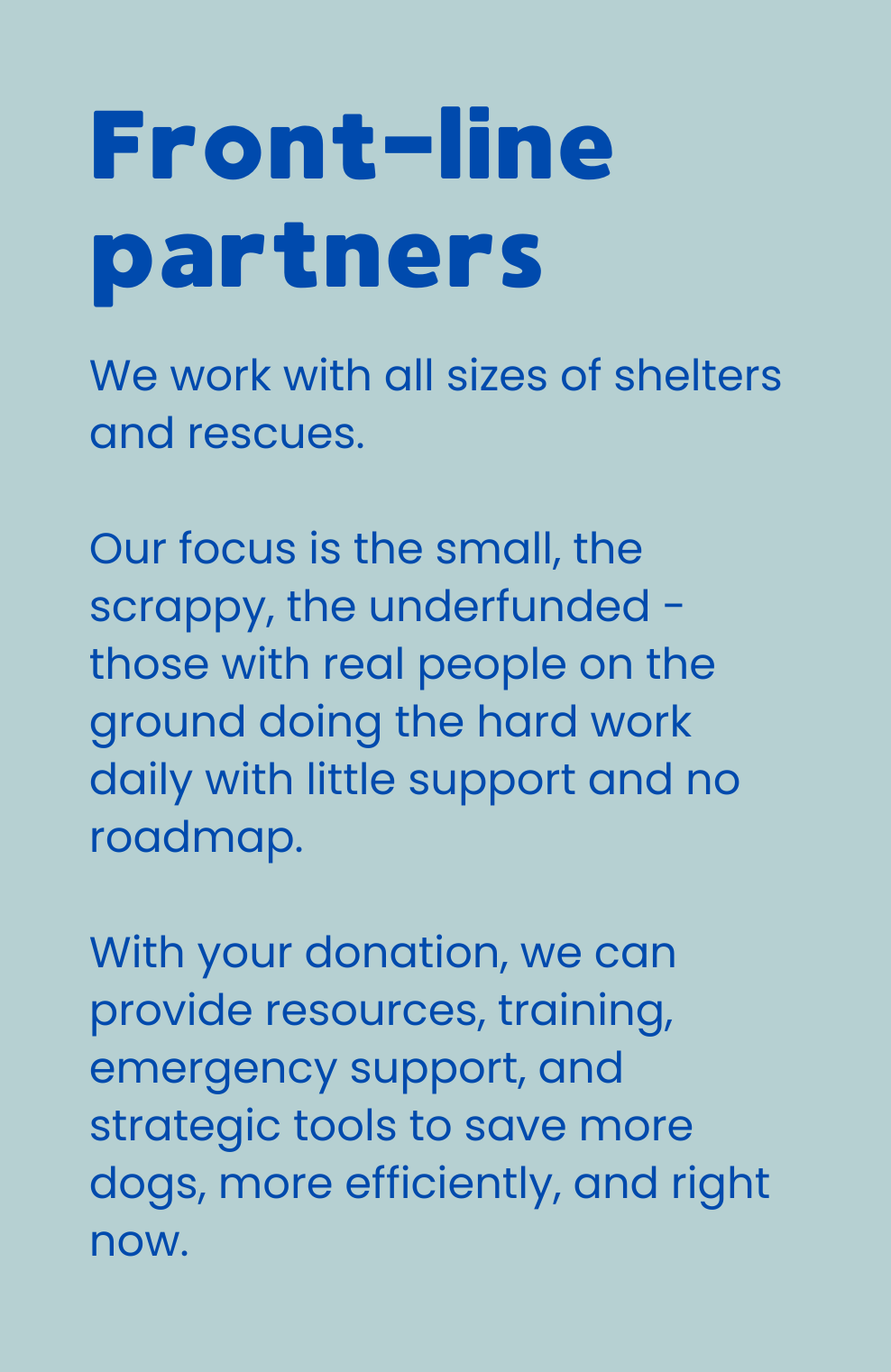 We provide tools, mentorship, and direct support to grassroots rescuers and advocate for long-term reform in animal welfare policy.