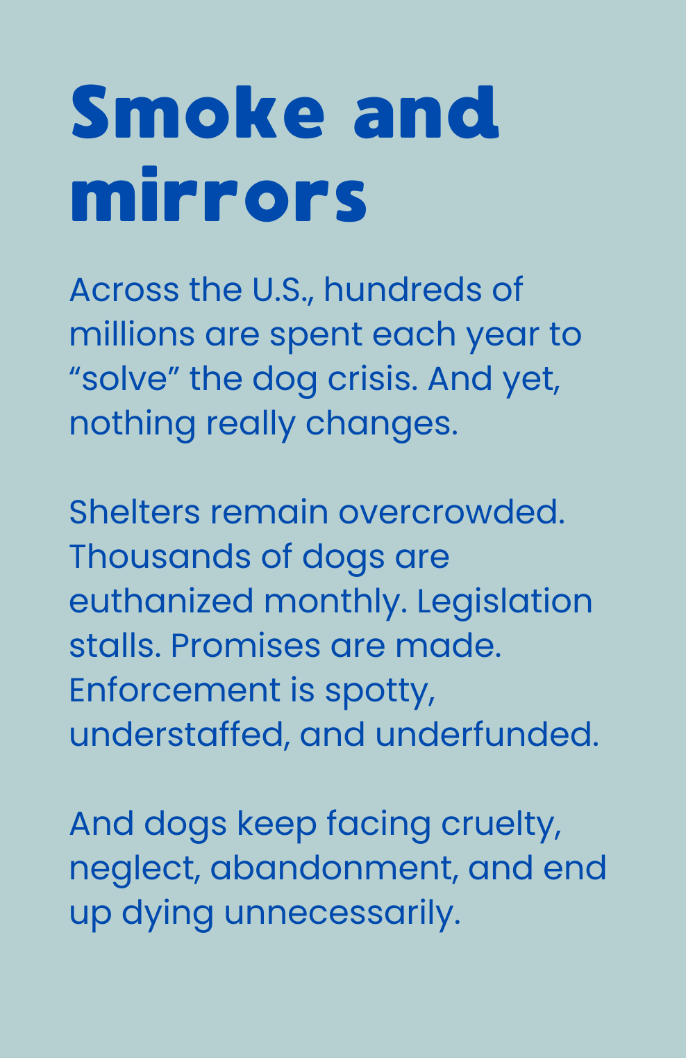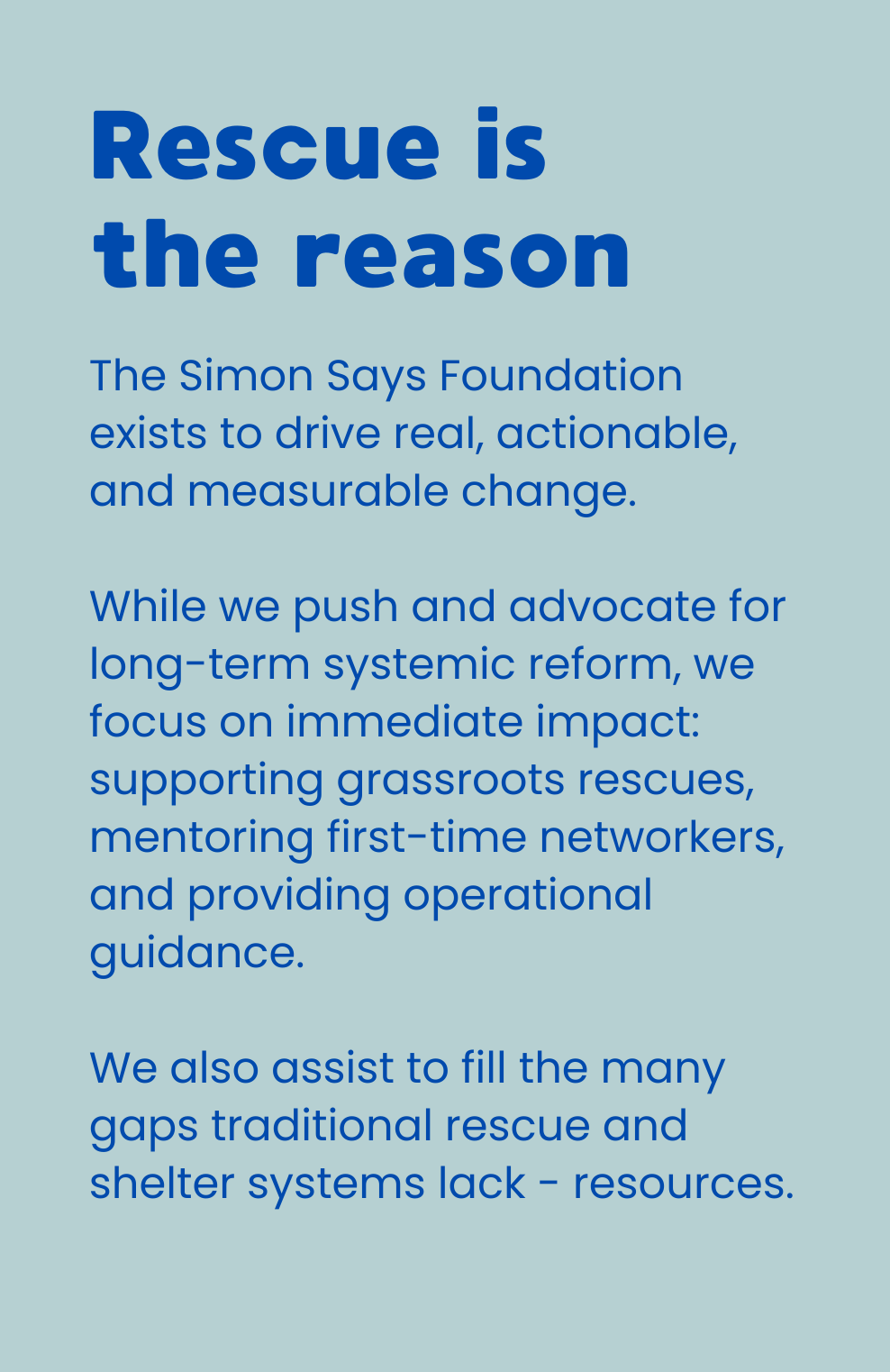 The Simon Says Foundation is committed to supporting under-resourced dog rescues. We also address the systemic failures contributing to the ongoing dog welfare crisis in the United States.