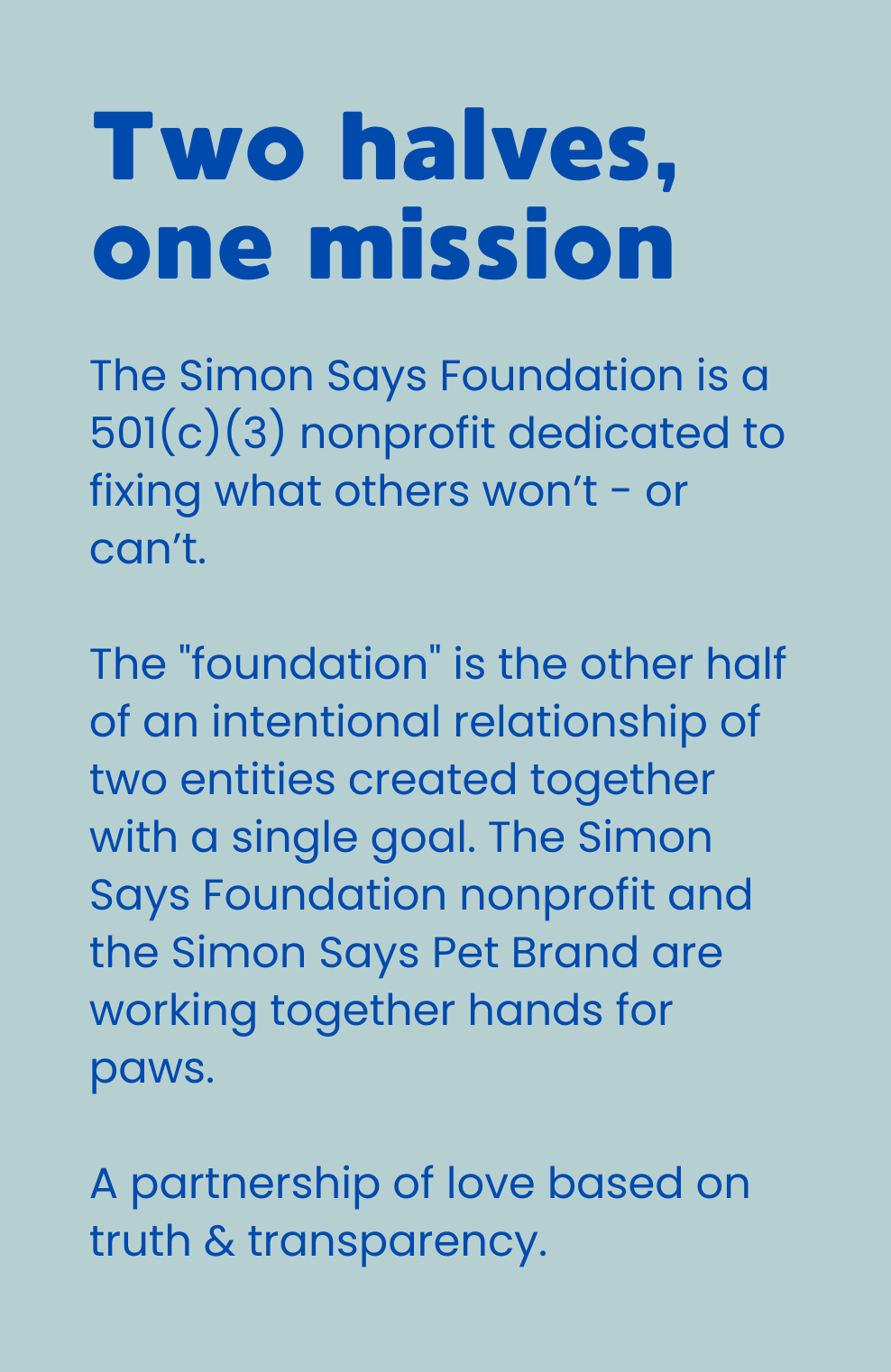 Simon Says Pet created specific Simon Says Foundation Items to help dogs. Every time one is purchased, Simon Says Pet gifts one to the rescue of choice. But they do more!